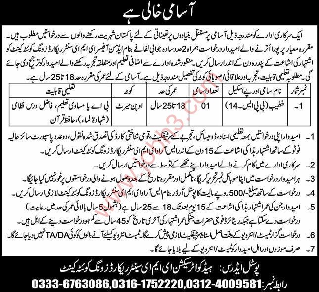 The EME Center Record Zone Quetta Cantt is offering a great government job for Khateeb. If you have the right qualifications, don’t wait!