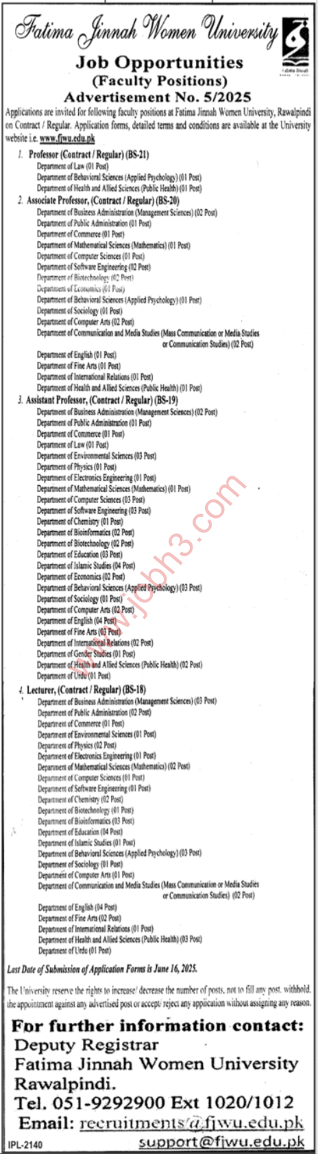 If you’re looking for govt jobs 2025, new jobs 2025, or karachi jobs 2025, the Fatima Jinnah Women University Rawalpindi Jobs 2025 are a great chance to grow your career.